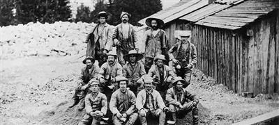 Jeden z pracovních týmů na skupinovém snímku z roku 1875. Stavba tunelu byla monumentálním dílem. K jeho stavbě byli povoláni dělníci z mnoha zemí.